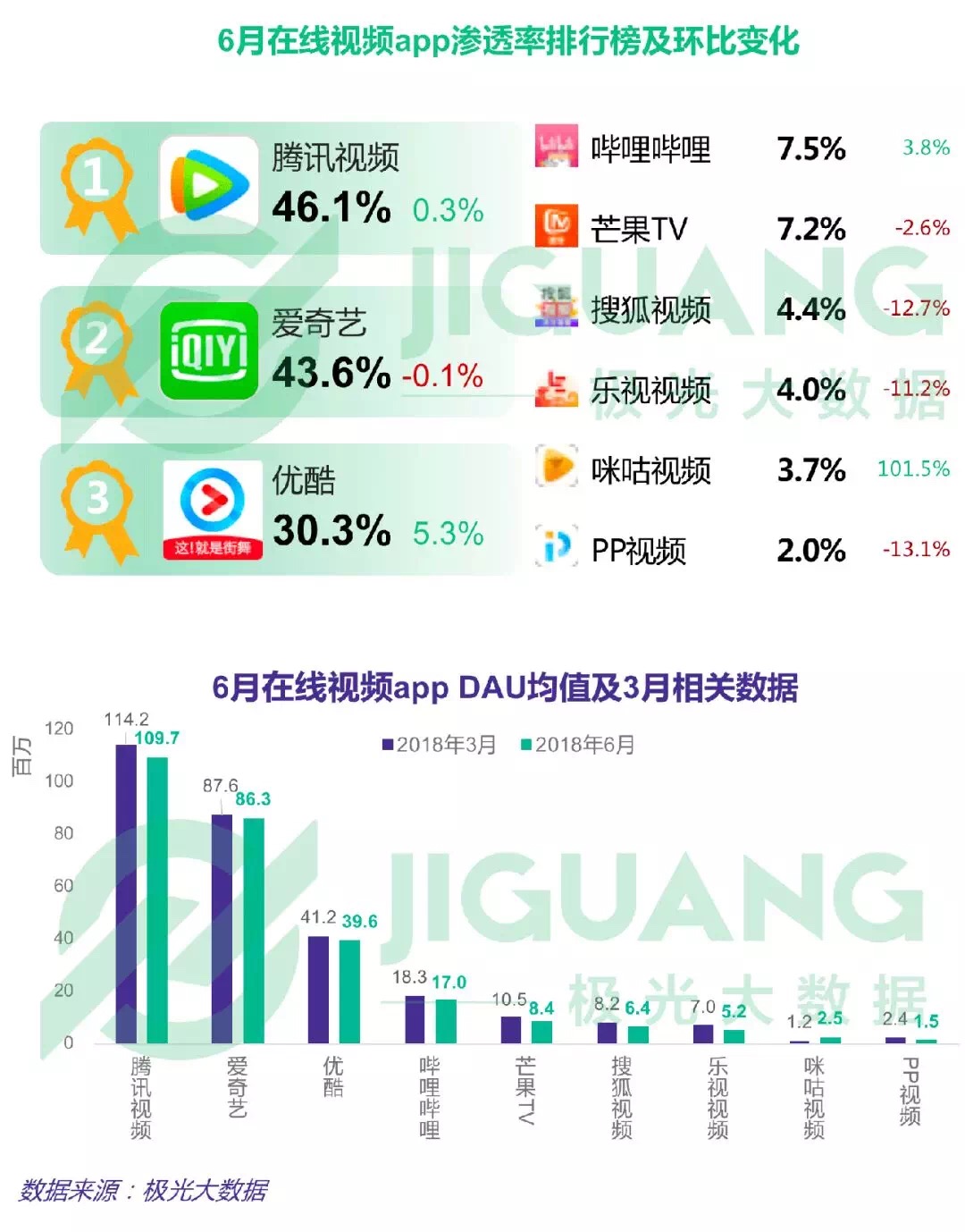 不过,腾讯视频、爱奇艺分别以46.1%、43.6%的渗透率保持在线视频领域领先位置,但DAU均值皆有所下降。
