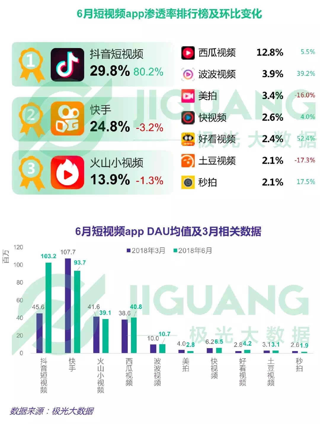 在报告中,短视频领域发生了新的变化。6月抖音短视频以29.8%的渗透率超越快手位列第一,季度环比增长80.2%,DAU均值破亿;居于第二的快手6月渗透率为24.8%,季度环比下降3.2%;头条系的其他短视频——火山小视频渗透率为13.9%,西瓜视频渗透率为12.8%。