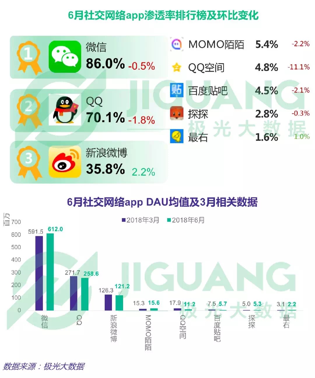 此外新浪微博和最右表现出一定增长。新浪微博渗透率达35.8%,相比3月增长2.2%;最右渗透率达1.6%,相比3月增长1.0%。