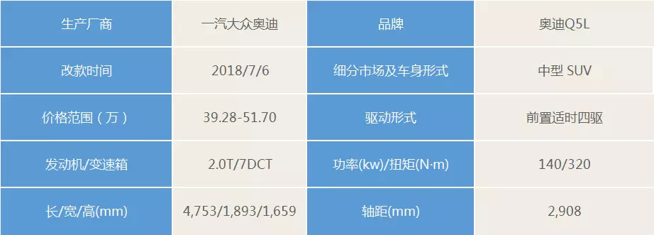 外观方面,奥迪Q5L跟海外版车型保持高度一致,不仅提升了车身尺寸和轴距,还一改上一代Q5的圆润外形,在各个细节之处加入了棱角分明的犀利设计。Q5L采用全新家族化的六角形前格栅并引入锐利的LED大灯组,侧身线条更加平直硬朗,尾灯造型的改变结合整体线条拉伸让尾部的横向视觉效果大幅拉宽。内饰方面,Q5L也完全沿用了海外版车型的样式,换装8.3英寸的液晶屏以及最新的MMI多媒体系统后,车内物理按键再次减少,营造出强烈的科技简约风。