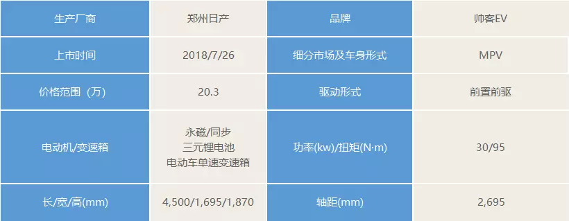帅客EV定位于一款纯电动MPV,全车采用了与燃油版帅客相同的外观造型,封闭式前格栅设计与车身为数不多的蓝色元素表明了其新能源身份,内饰方面,帅客电动版的内饰与燃油版帅客也基本保持一致,采用7座式布局设计,整体设计并不出众。与帅客EV一同上市的还有一款纯电动厢式运输车,在大部分“商转乘”的车企当中,郑州日产旗下帅客系列车型的步伐相对较早,但是多年过去,帅客并没有真正摸索出一条适合自身品牌形象的设计理念,从现在的帅客和新车帅客EV来看,这些车型依旧偏向于低端化,更多侧重点也仍放在拉货等商业用途上,面对二三线甚至四五线城市消费者对于MPV的需求升级,家用化已经成为如今MPV车型的必然趋势,面对这样的趋势,郑州日产显然还需要更多的准备和投入,才能为自身在未来的竞争中增添筹码。