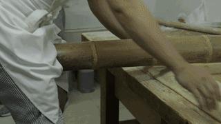 取出两米高竹竿固定于墙身,跨坐在竹竿之上,弹跳在木板之间,运用巧力将面团反复弹压,使其筋道十足。过机数次,使面团逐渐变薄,均匀抹粉,才能放入机器中最后切成粗细一致的云吞面条。