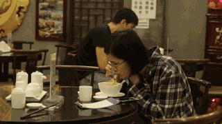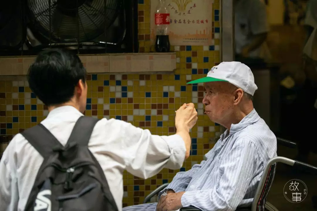我在一旁照看器材,此时对面正好来了一对看似父子的客人,那个大约五十多岁的大叔把一位穿着病服的老爷爷推至墙边一角,固定好轮椅后才去下单。待云吞面上桌后,大叔从书包里掏出一个保鲜袋,再从中拿出一把剪刀,直至将碗里的面条全数剪碎,才推到老人面前,让他拿起汤勺一口一口慢慢吃着。