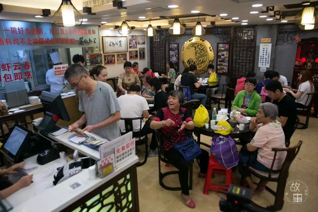 十点刚开门,食客还不算很多,三三两两来吃一碗鲜虾云吞面,作为一顿丰盛的早餐。大约十二点多,外头下着小雨,店里的客人逐渐多了起来,门店经理英姐开始忙前忙后的招呼,特别是那位独自前来的老奶奶。
