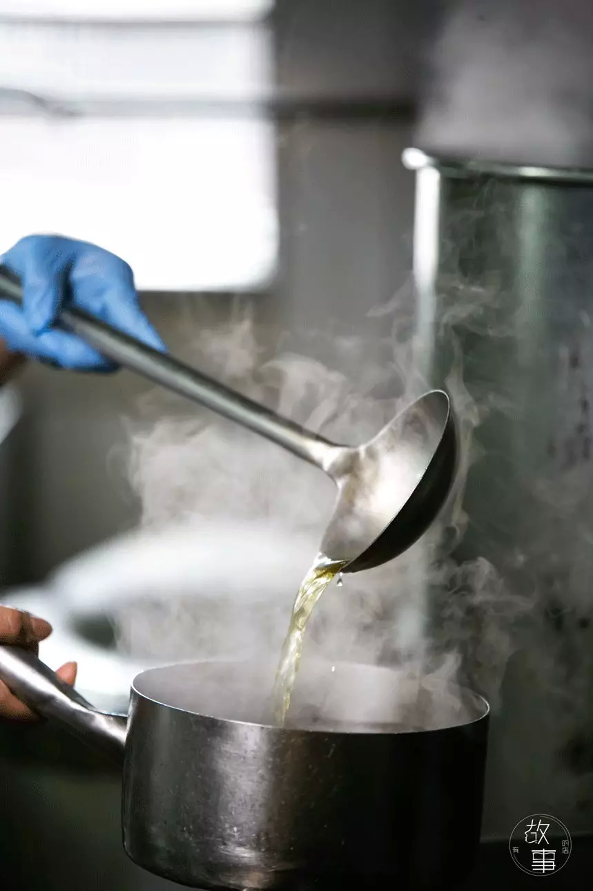 早上五点,熬汤的师傅早早回到店里,把二十斤的龙骨,十来条碳烤过的大地鱼骨,再加上乘虾壳干,一并放入汤炉中熬制,供一天汤头使用。每天如此,从未间断。