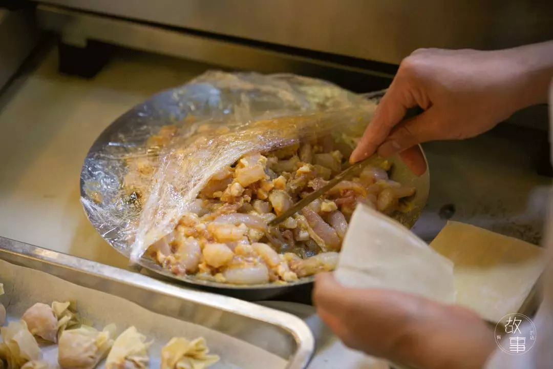 选用猪上肉,剔除影响口感的肉筋,把肥瘦肉分别切成片状、再到条状、最后呈粒状,加适量盐、蛋液搅拌均匀,此乃最原始的云吞馅料。随后按七三比例,把瘦、肥肉包裹在云吞皮之中,手指一收一捏,一颗饱满的云吞便已成型。