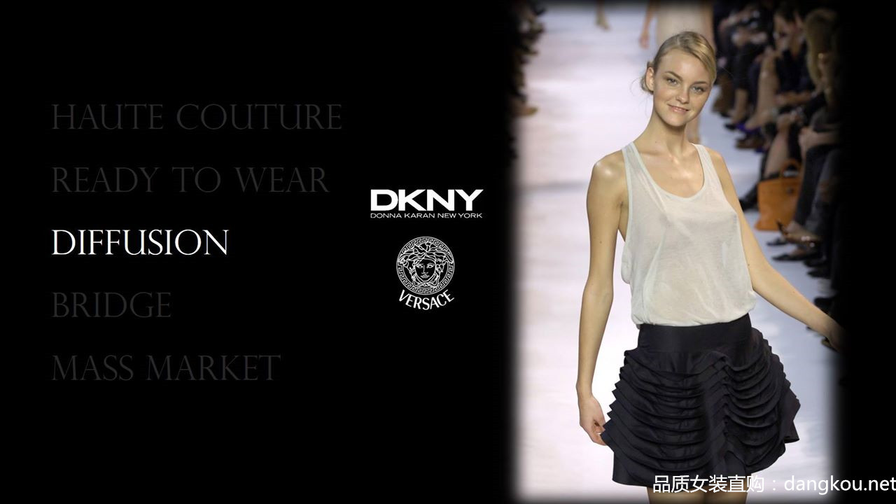 “Diffusion”阶层比Ready To Wear更有商业成衣以及实穿的风格。包括了Prada的副品牌Miu Miu、Donna Karen的DKNY、Versace的Versus等,就连Giorgio Armani也有推出它的Diffusion品牌──Emporio Armani!