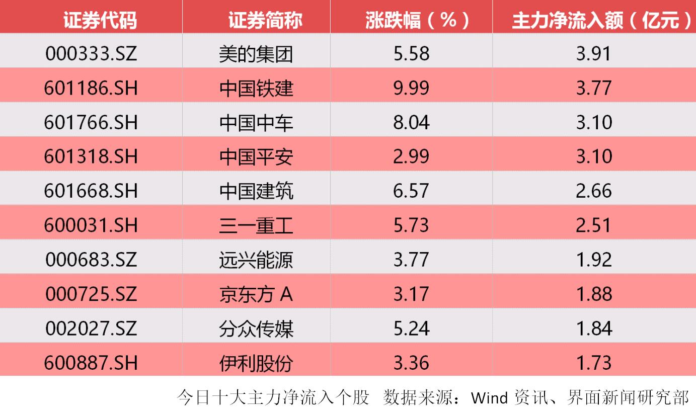 个股表现上看,全天沪深两市有21只个股主力资金净流入额超1亿元。除去未开板新股,美的集团(000333.SZ)获3.91亿元主力资金流入居首;中国铁建(601186.SH)、中国中车(601766.SH)主力净流入额居前,分别净流入3.77亿元、3.10亿元,中国铁建涨停,中国中车涨幅超8%。