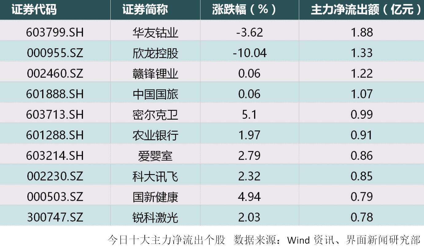 沪深两市共计4只个股主力资金净流出额超1亿元。华友钴业(603799.SH)、欣龙控股(000955.SZ)、赣锋锂业(002460.SZ)是今日主力资金流出重点,规模分别为1.88亿元、1.33亿元、1.22亿元。ST长生(002680.SZ)连续16日跌停,兴业证券起诉张洺豪夫妇。