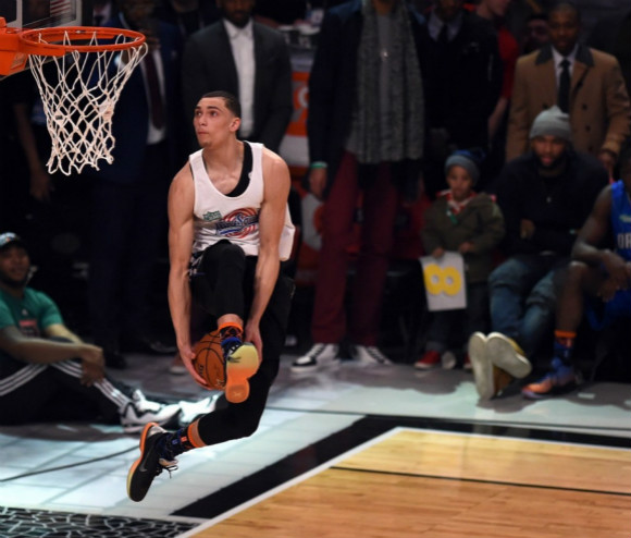 2015年全明星周末扣篮大赛之夜,还有四个星期满20岁的扎克·拉文,身着《太空大灌篮》电影中乔丹和兔八哥披过的球衣——那电影是他出生那年拍摄的——从球场右底角出发,抛球,跑动,起跳,空中左手揽球,上升,右腿抬起,左手将球绕过胯下,抬头,看着篮筐从额头上方进过,球交右手,扭动身体,确认篮筐还在自己头顶,篮网拂过他的脸,抡臂,扣篮。