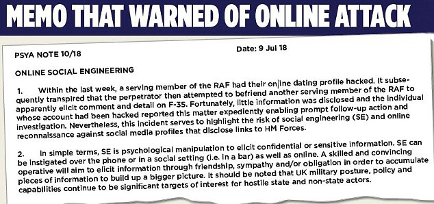 据备忘录所述,一名皇家空军女兵在约会软件Tinder上的个人信息遭黑客盗取;此后,一名间谍伪装成该女兵与皇家空军的男性士兵聊天,从其中至少一人处套得了与F-35有关的消息。