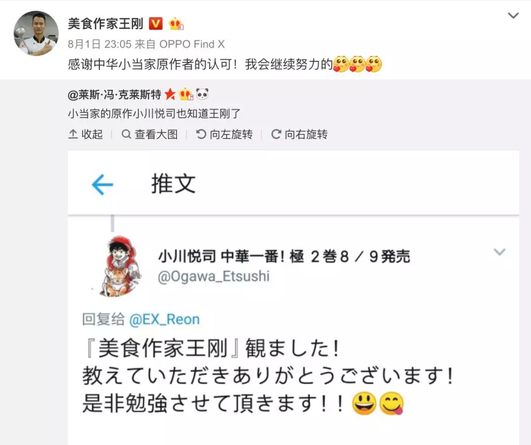作为一位传播正宗中华美食文化的使者,王刚在Youtube也拥有25万粉丝,还开通了推特账号,连《中华小当家》的作者小川悦司都亲自发推:“看了美食作家王刚!”