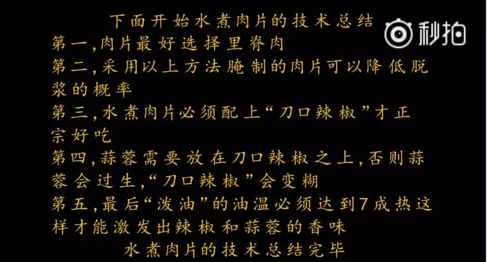 利落的切炒身手,配上快节奏的剪辑和热油、爆炒、颠锅声音,就是王刚老师的硬核美食朋克。一份黑底黄字的“技术总结”,则为整个教学视频注入灵魂,真正的“明人不说暗话,王刚不说废话”。