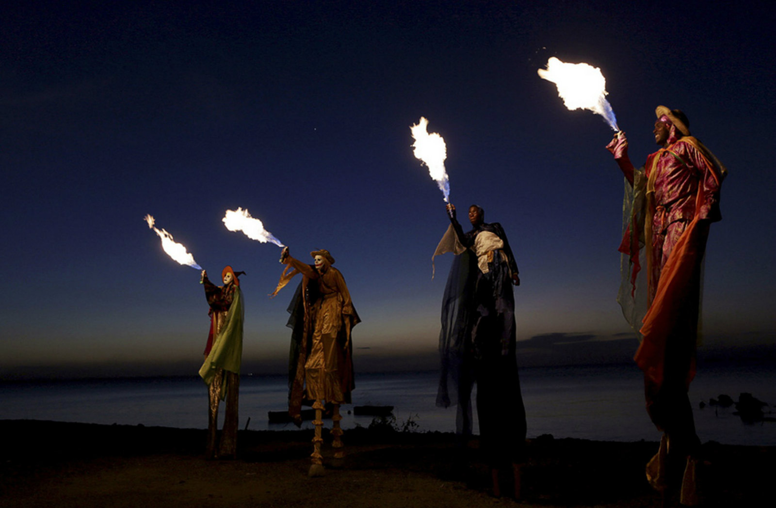 2015年2月10日,在特立尼达的圣费尔南多,踩高跷艺人正在水边表演喷火。