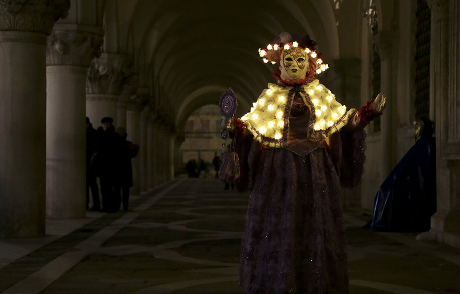 2015年2月7日,在威尼斯嘉年华上,一名戴着假面的表演者出现在圣马可广场上。