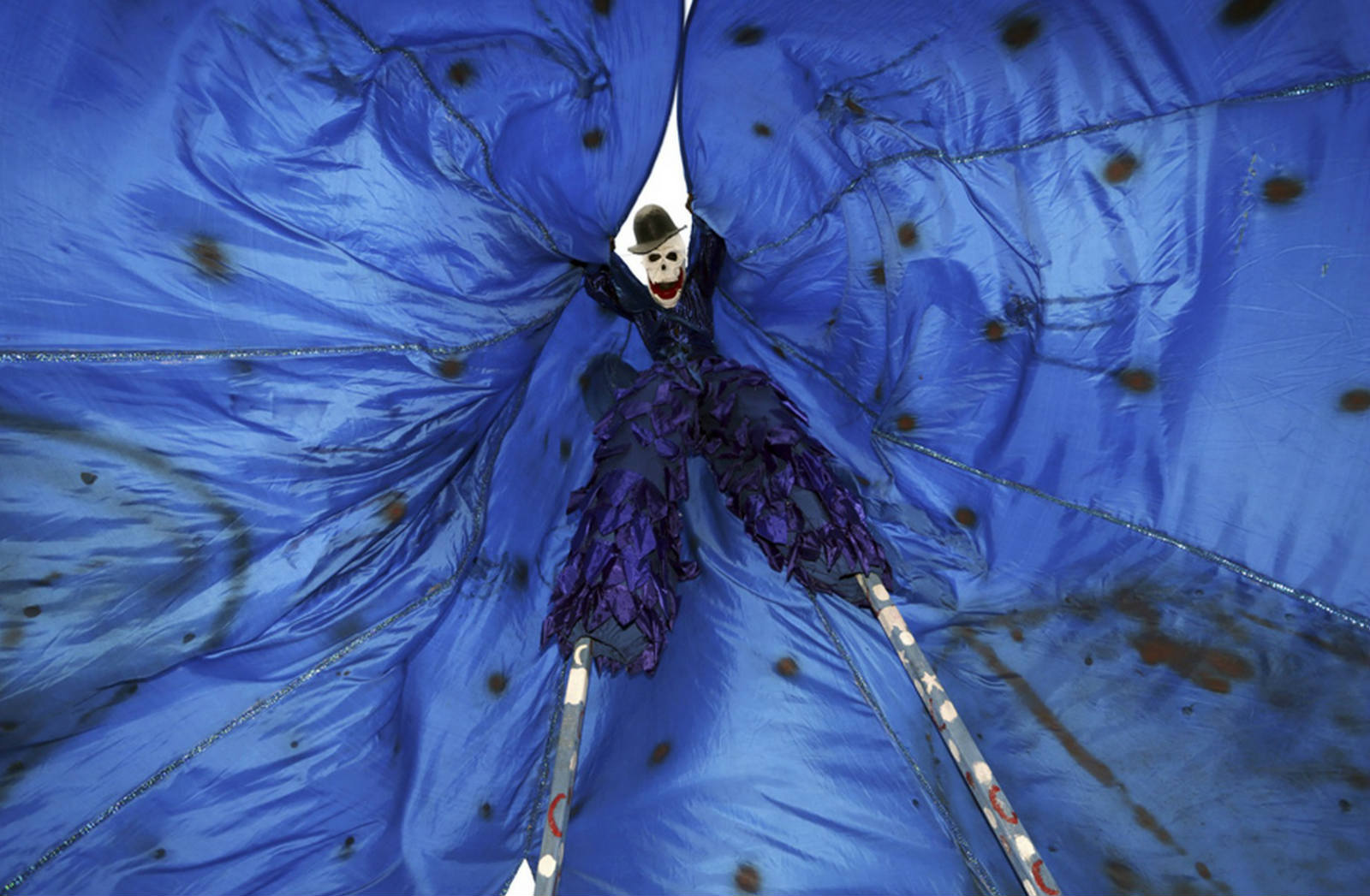 2015年2月13日,表演者Sheldon Best身着他的戏服——蓝月亮("Once In A Blue Moon")。Best赢得了在特立尼达和多巴哥首都西班牙港举办的全国嘉年华大赛、传统踩高跷类的冠军。