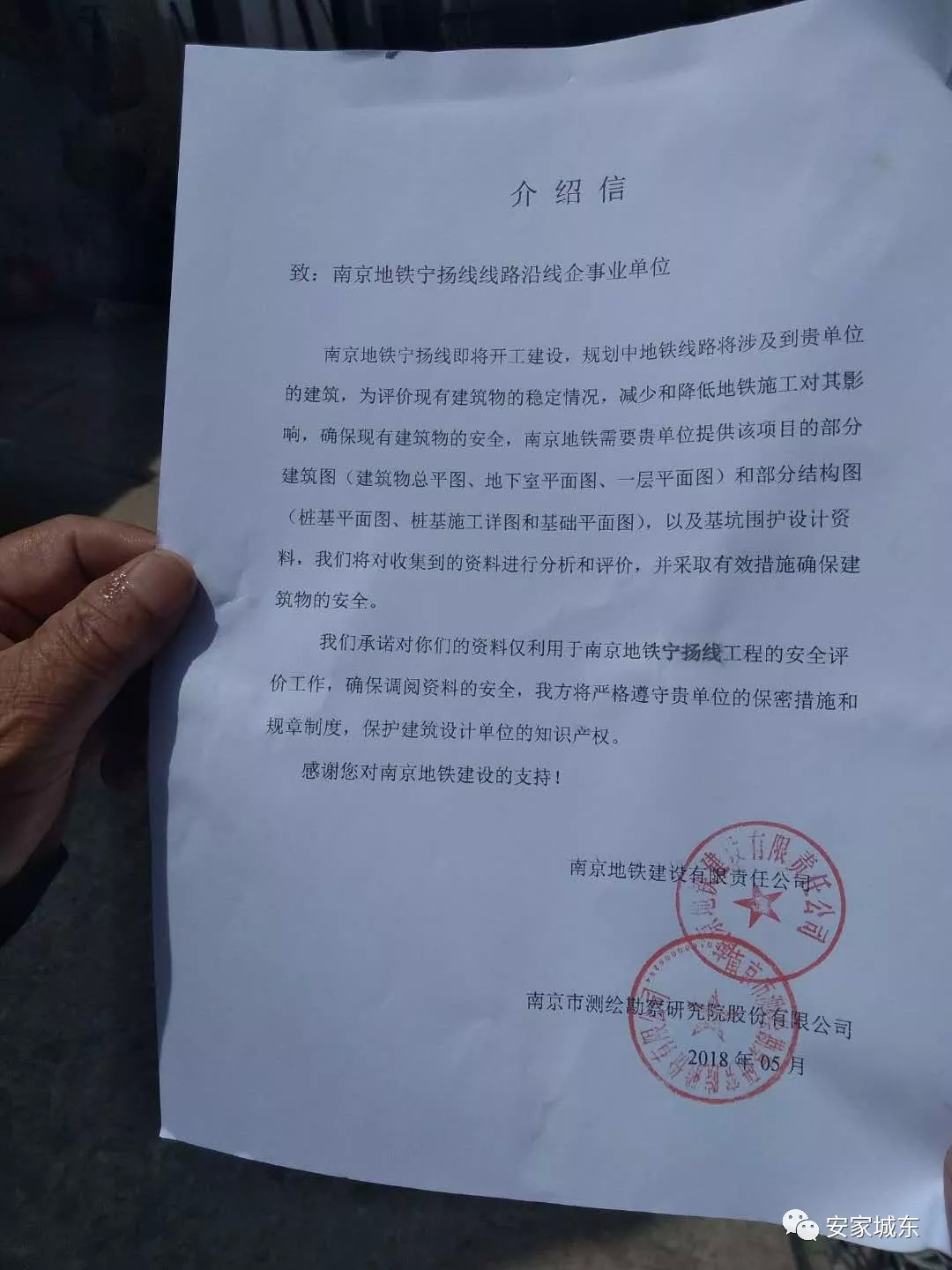 5月份,南京地铁建设有限责任公司和南京市策划勘察研究院股份有限公司向宁扬线线路沿线企事业单位发出了介绍信。