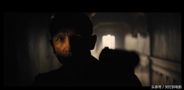 詹姆斯·邦德从后景软焦当中以剪影的形式走来,到了近处才被一束光线照亮他的面部,同样是突出了眼睛,但这一次导演想表达的更是人物的机敏与警觉。