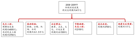 到2009年一季度,4万亿投资规划主要投向在民生工程、基础设施建设、节能减排、技术改造、以及地震灾区恢复重建等内容。其中,包括铁路、公路、机场、水利等在内的基础设施约在1.5万亿左右,如果再加上民生工程(包括保障性住房和农村安全饮水、电网改造、道路建设、沼气建设、危房改造和游牧民定居),以及汶川大地震重点灾区的灾区恢复重建,与基础设施建设相关的投资,将近3.3万亿,超过4万亿投资规划的80%。