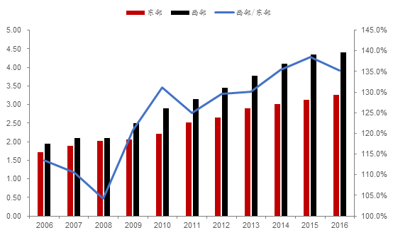 图表3 东部与西部地区人均基础设施相对量比较(06-16)