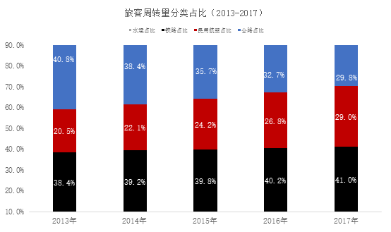 图表4 旅客周转量分类占比(2013-2017)