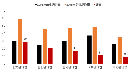 如果把2008年作为界限,在2008年之前,全国有148个机场,其中有6个机场在2008年之后停用;2008年之后,新增加了87个机场,这87个机场中有67个建设在北方、西北、西南三大机场群,而华东和中南机场群一共仅建设了20个新机场。