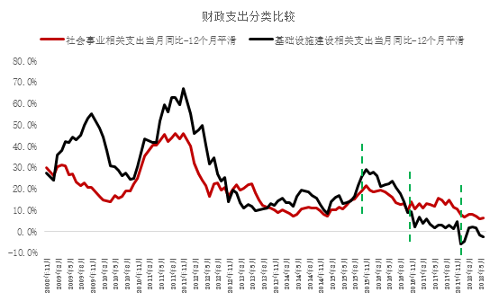 但从2015年开始,财政支出结构发生了一定程度上的转向,基础设施建设相关支出的增速出现了回落,并逐步低于社会事业相关支出的增速。