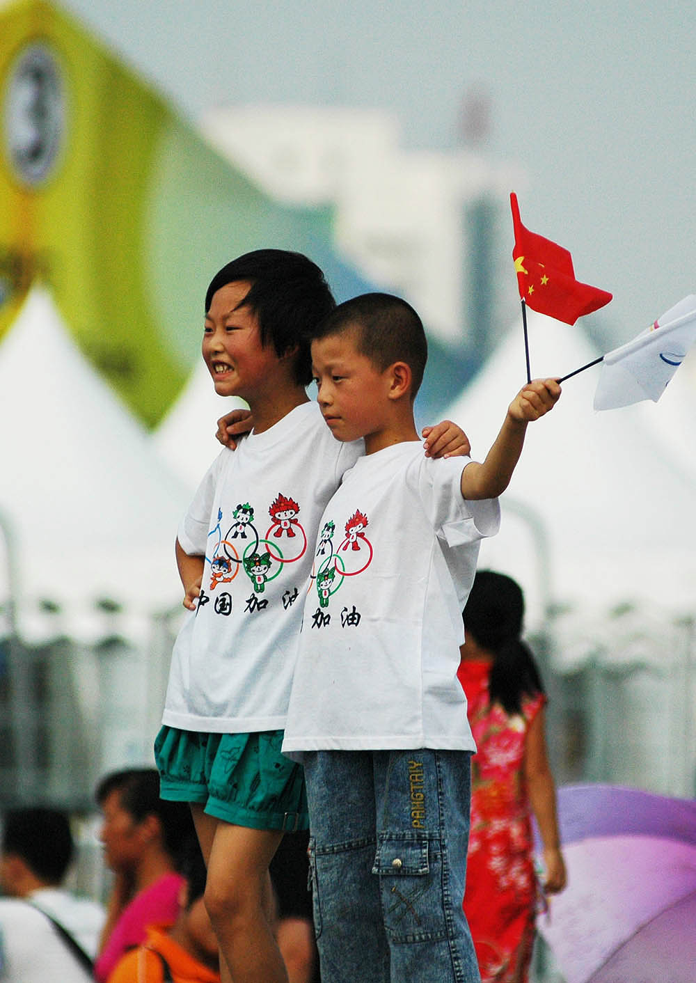 一对小朋友在“鸟巢”前手持旗帜庆祝奥运召开。