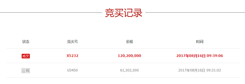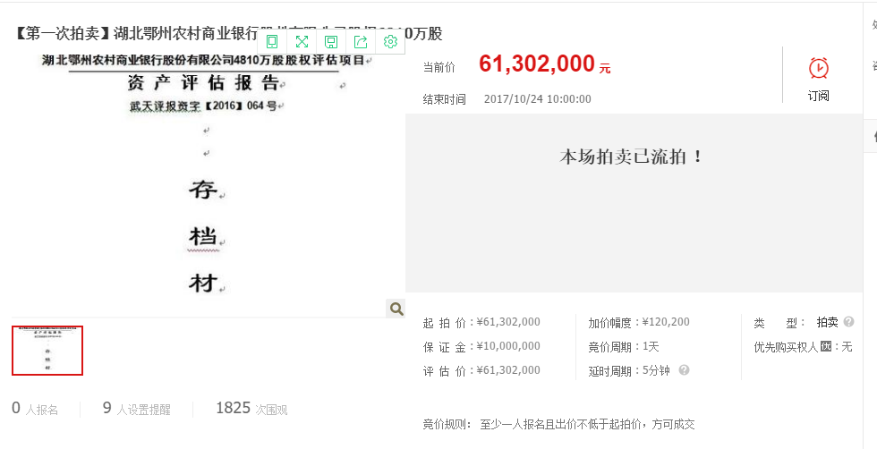 界面新闻记者发现,淘宝司法拍卖网站的过往拍卖信息显示,此前曾有过两次鄂州农商行的股权拍卖信息。具体而言,这两次拍卖的标的物为同一个——鄂州农商行6010万股权,原来的所有者为湖北万基房地产有限公司,第一次拍卖发生在2017年8月16日,有人以1.202亿拍得该行股权6010万股。但是从拍卖纪录来看,出价明显不合常理,最后成交者并未付尾款。