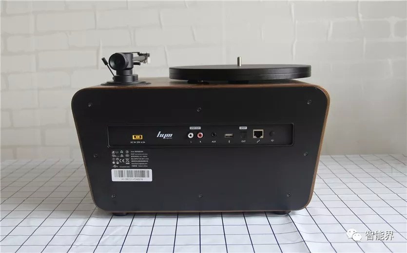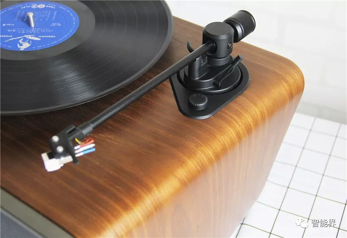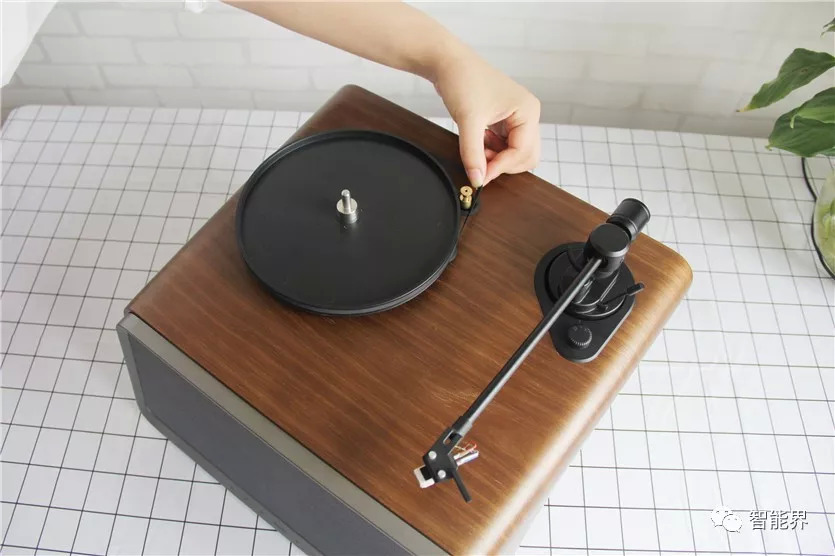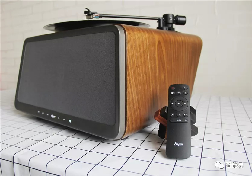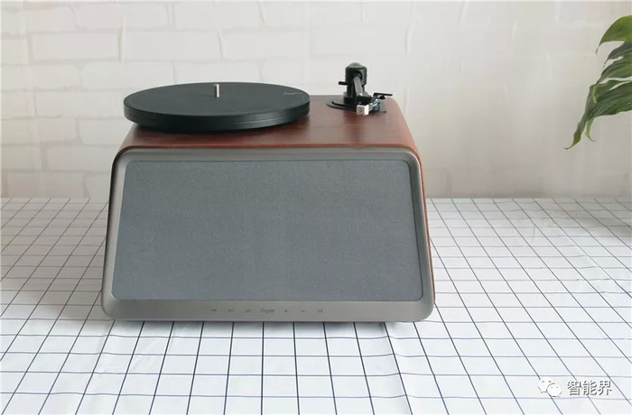 安装完毕,来看看它的样貌。通常,黑胶唱机都是体积庞大,除了唱机外还需要准备唱放以及独立喇叭。但,HYM团队把黑胶唱机和智能音响融合到了一起:智能音响造型采用翻转曲木设计,大胆前卫。