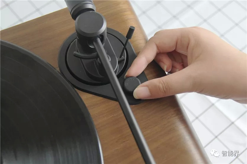 旁边的唱臂控制杆很纤细。它的作用就是控制唱臂带动唱针起落。
