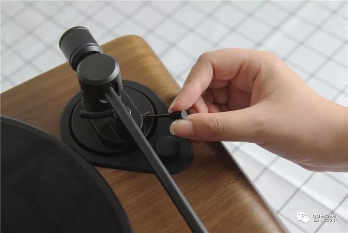 而另一部唱盘和唱盘垫依次安放。最后,在唱针上还有一个保护套,这个唱针当然是唱片机最重要的部分。