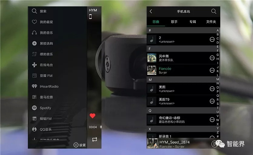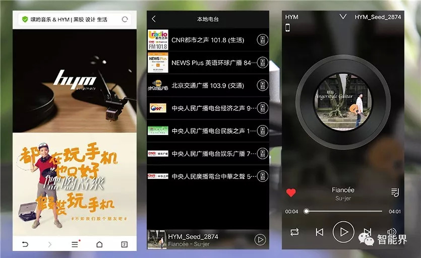 打开APP,这里又提供了多种收听方式。比如可以播放手机本地音乐,相信各位跟我一样下载到手机保存的应该都是非常喜欢的音乐吧,否则手机就那么大的空间,下载音乐占用存储空间呀。当然,这里也提供了在线听音乐的入口,比如QQ音乐,在HYM APP里就可以直接跳转。