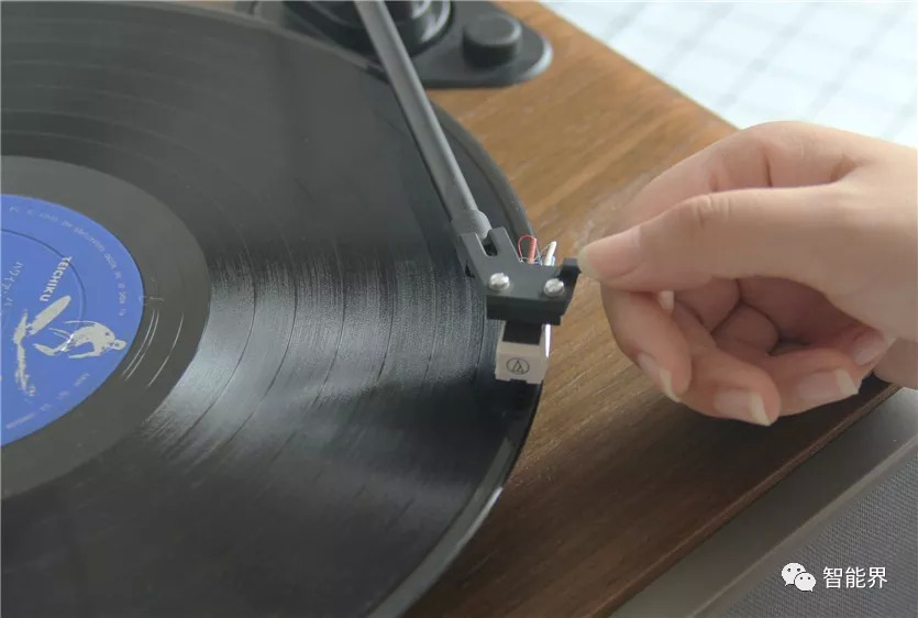 把唱片放在唱盘上,选择“33”转,唱片就转动起来,接着把唱针移到唱片边缘,拨动唱臂控制器,唱头缓缓下沉,唱针接触唱盘,音乐响起……