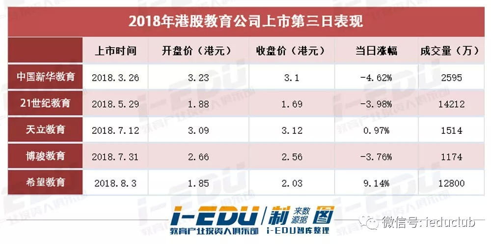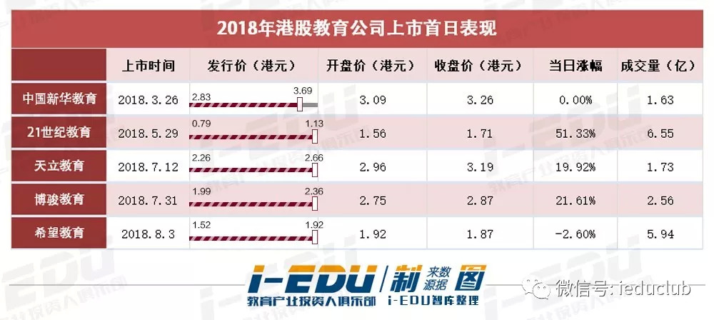 2018年已赴港上市的5家公司中,除中国新华教育外,21世纪教育、天立教育、博骏教育以及希望教育均为顶格定价。公司把上市价格定在区间最高值,主要是考虑到上半年港股教育板块持续走高,上市前路演顺利,以及投资者对后市表现的期望。同时,对比2017年,2018年新上的5家教育公司,上市首日成交量明显增大,也进一步反映了市场的热情。可见港股教育板块整体的良好表现给了上市公司足够的底气。