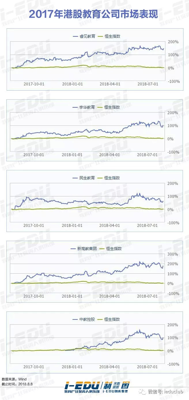 上市之初,睿见教育、新高教集团及中教控股的股价皆呈平稳态势,宇华教育上市半月后迅速拉升,而民生教育股价则从上市之初便一路走低。虽然上市之初股价受多种因素影响,涨跌差异性较大,但回顾2017年5家港股教育公司的整年表现,可以发现,港股中教育板块实现了普涨,且明显跑赢恒生指数,5家公司中有四家年涨幅超100%,其中睿见教育及新高教集团涨幅将近200%。