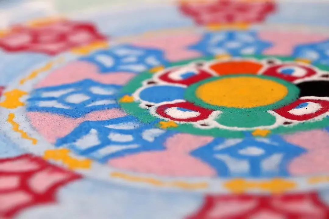 在采久寺还有幸遇见了一场佛国盛事——坛城沙画,一般在重要的佛事活动中,由地位较高的众多喇嘛,从画图到挑选沙粒到营建,辛苦经营数月才能完成,而在完成的那一刹那就付诸流水。坛城是藏传佛教的精神家园,“可以辛苦地拿起,也可以轻松地放下,一次次被抹去,因而一次次建立。”站在坛城前,感动和震撼久久回荡。