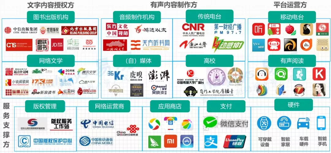 而在这四大基本板块中,又可以继续进行细分。比如,文字内容授权方中,出去传统的图书出版机构外,网络文学,以及新媒体的高度发展和极短的生产周期和高生产速度,都极大地提升了整体产业链的运行效率。又比如有声内容制作方还可以划分为自媒体、专业音频制作机构以及传统广播电台等。