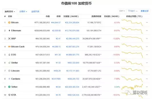 市值最大的比特币跌势不止,其他主流币也免不了跟风下跌。截止下午3点,除了与美元挂钩的USDT为上涨外,市值前十大主流币的24小时跌幅均大于5%,热门币种柚子EOS更是达到了14%的跌幅。