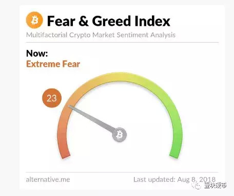 一个将多方因素综合而成的“恐慌与贪婪指数”显示,自7月30日开始,该指数直线下降,截止今日,其值为23,表现为“极度恐慌”。其中值0表示“极度恐慌”,而值100表示“极度贪婪”。该网站显示,在2018年2月6日时,该指数曾达到了8的最低值。