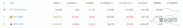 资金也呈现了大额流出的局面。AICOIN数据显示,截止下午3时,FCoin平台币FT的资金净流出最大,达107.1亿;比特币排在第二,24小时资金净流出达38.4亿;以太坊24小时资金净流出25.8亿排第三。