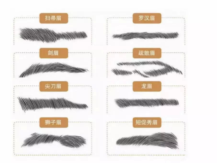 特点:眉形上挑,眉尾向两侧鬓角方向延伸,较为直且尾端翘起略呈剑形。比较适合圆形脸,因为圆形脸在气场上会稍有逊色,但是挺拔的剑眉却正好中和这一点,显得更为英俊、剑眉 较绅士有男子气概、使眼睛更加有神,同时修饰脸部使其更有轮廓感。