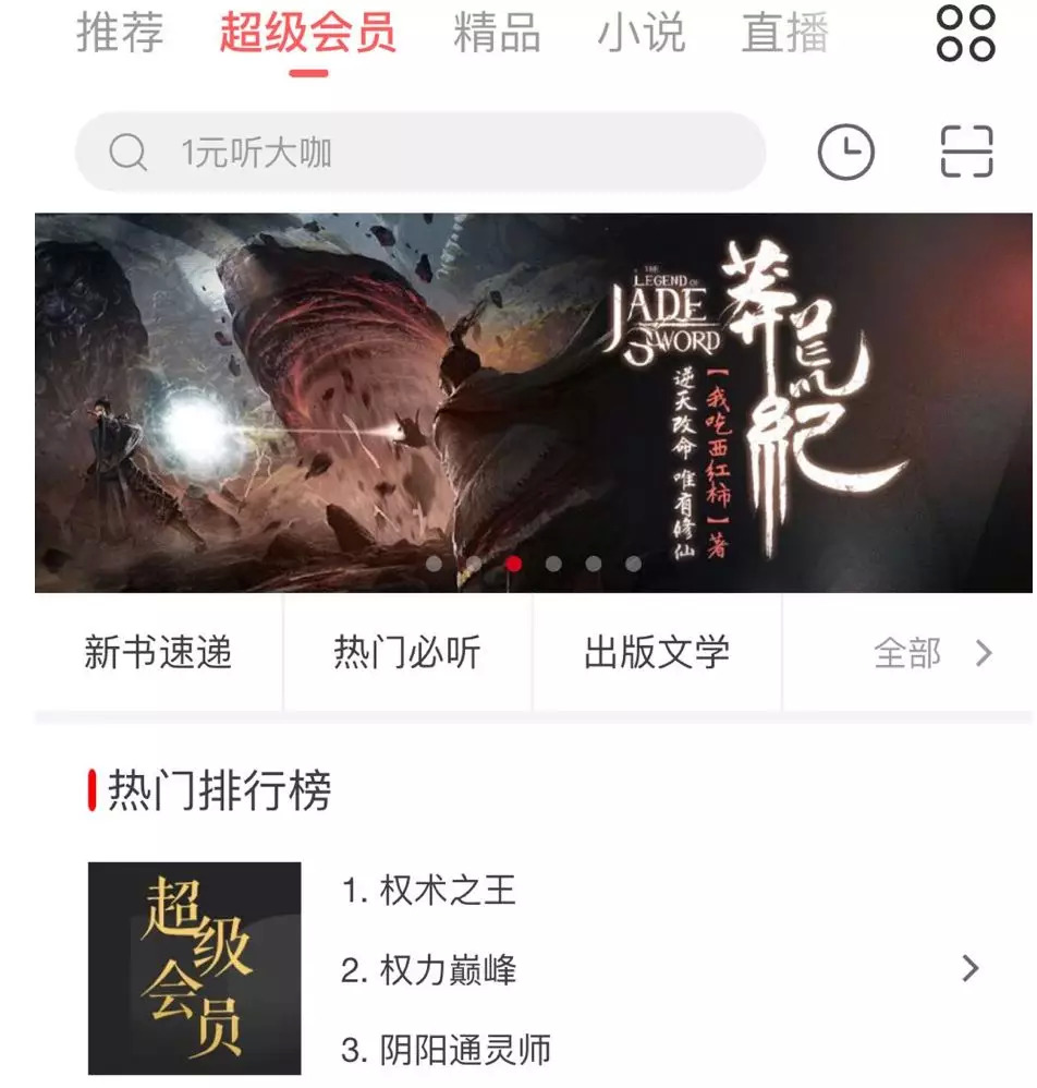 今年4月,蜻蜓FM推出超级会员服务,售价198元/年。第一阶段的会员免费畅听权益包含7000多部网络文学和2000多本出版精品,《人民的名义》《大唐荣耀》《海上牧云记》《我们仨》《白鹿原》《白银时代》等畅销付费有声读物都涵盖其中。即将到来的第二阶段会员权益中,还将增加蒋勋、张召忠、方文山、杨迪等大咖的付费节目。