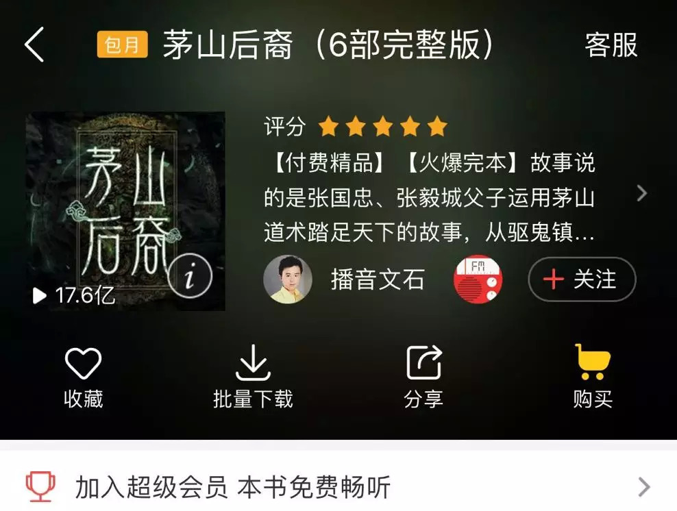 自2016年10月金庸武侠系列作为第一档付费有声书上线起,蜻蜓FM推出付费有声书已有近2年,其中大部分有声书定价在0.2元/集左右。蜻蜓FM平台数据显示,曾入选第三届中国网络视听大会年度优秀原创网络视听作品的《茅山后裔》,截至目前累计播放量已逾17亿,这也是蜻蜓FM最为畅销的付费有声书之一。