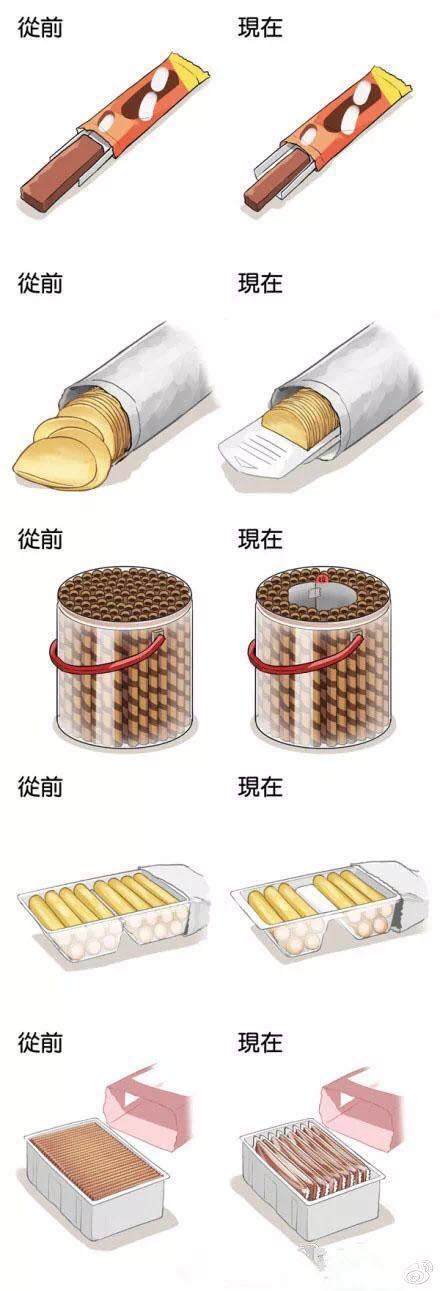 我们发现了一个非常有趣的现象,在包装不断更新、越发复杂精美的同时,食品份量在成正比地缩水。