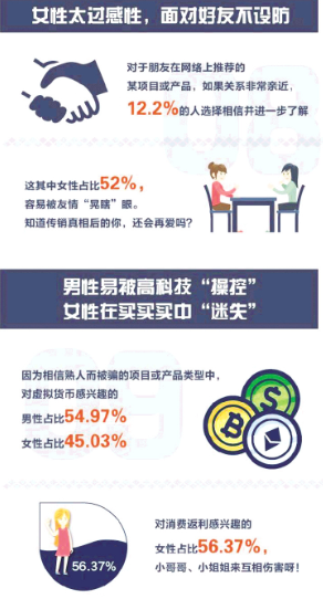 《报告》指出,男性和女性上当受骗的原因也各有不同。男性易被高科技“操控”,而女性则容易在“买买买”中“迷失”:因为相信熟人而被骗的项目或产品类型中,对虚拟货币感兴趣的男性占比54.97%;而对低投入高回报项目、消费返利感兴趣的男性占比43.63%,女性占比56.37%。