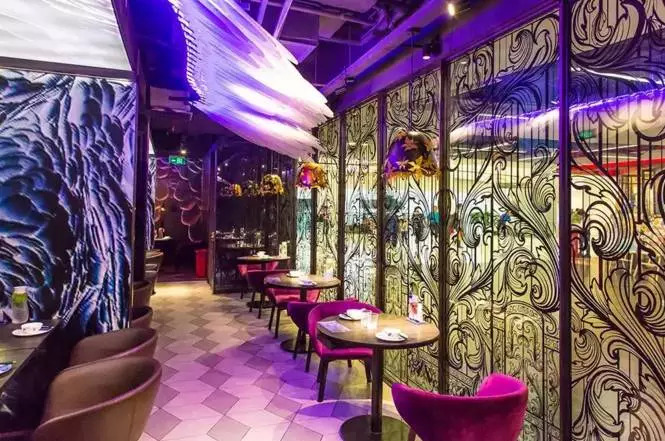 在就餐区,他们以神秘的紫色作为主色调,搭配黑色雕花镂空钢材,墙面、地板大片羽毛图案,就像英式宫廷高贵夫人的宴客厅。