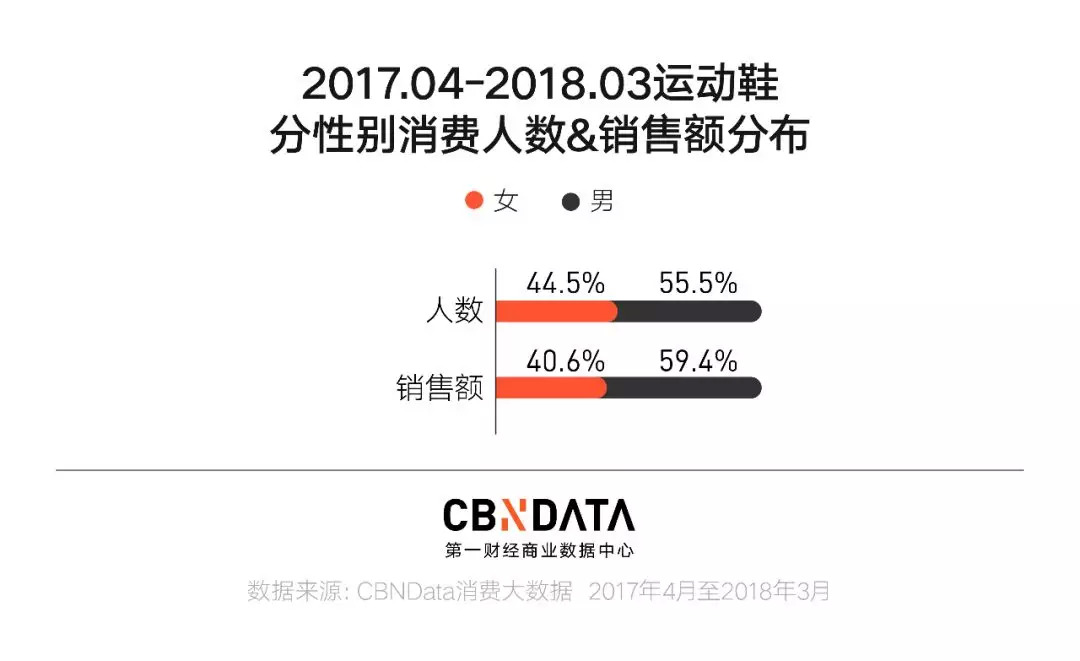 按性别来看,不论是消费人数还是贡献的消费额,2017年男性消费者在线上运动鞋的消费上都是绝对的主角。而且销售额占比高于消费人数占比,说明不仅买鞋的汉子多,他们也舍得花。