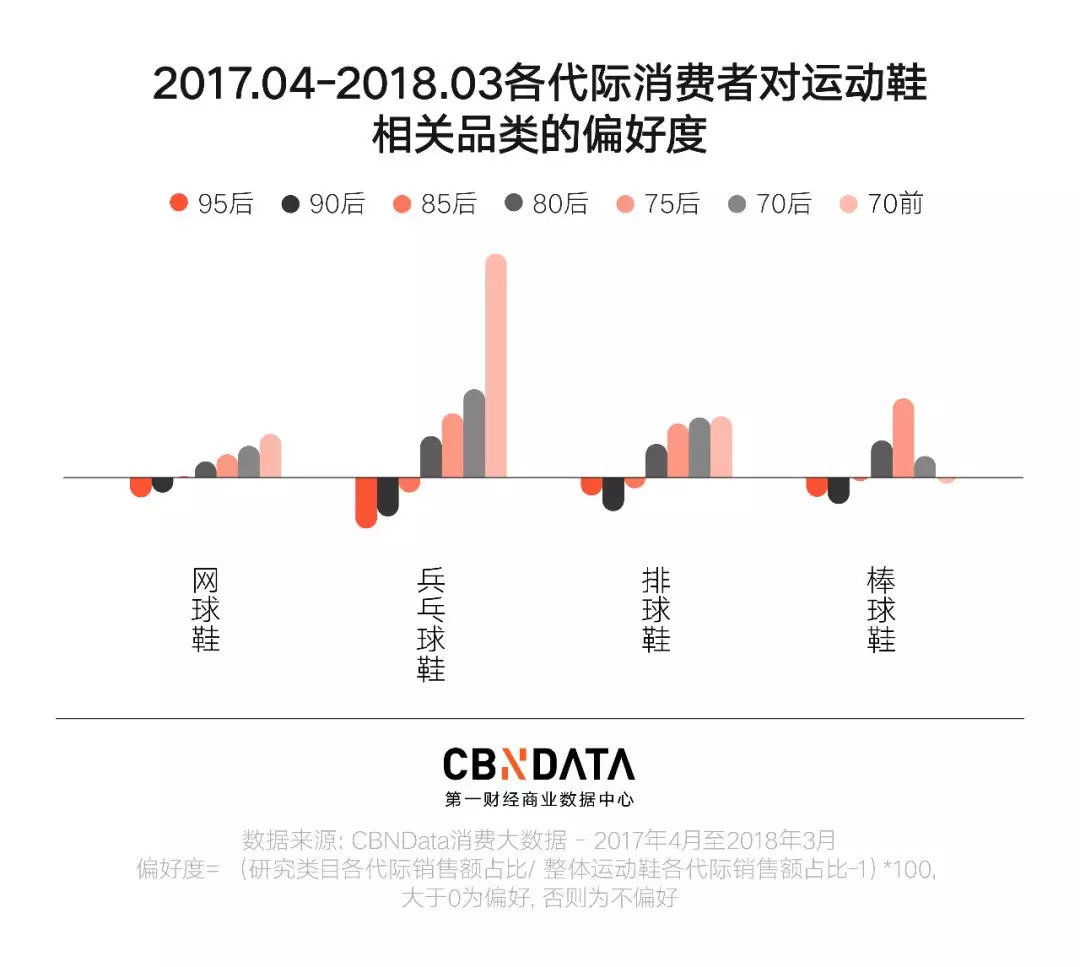 一条腿进入到老年人行列的70后,则是乒乓球鞋的真爱粉。此外,羽毛球鞋、排球鞋也受到非90后95后的“中老年团”普遍偏爱。