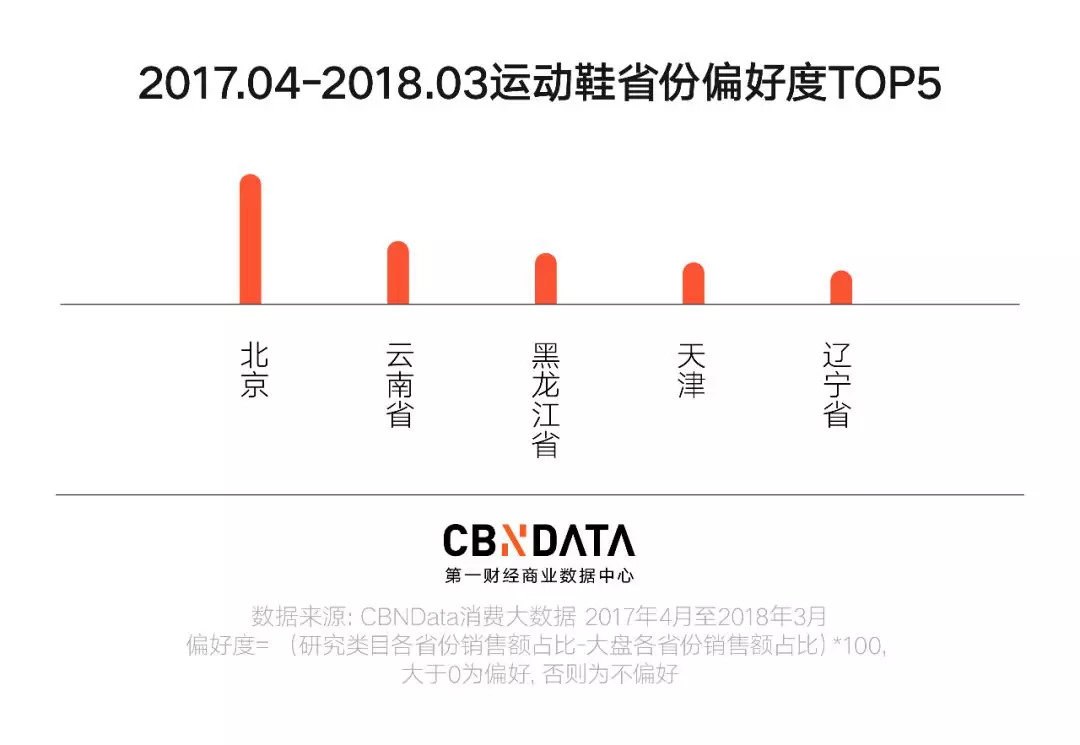 从地域来看,对运动鞋品类更偏好的省份以北方省份为主。进入运动鞋偏好省份前五名的有北京、云南、黑龙江、天津和辽宁。北京对于运动鞋相关品类的偏好度最高。在跑步鞋、板鞋/休闲鞋、篮球鞋等销售额较高的品类中,北京都进入前三。